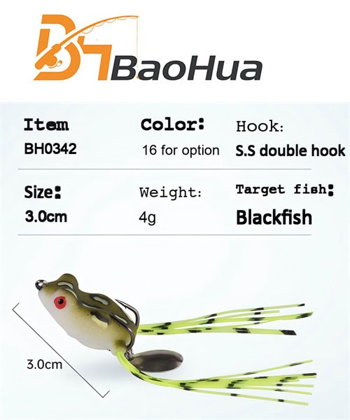 BHA0342 3cm 4.2g Soft frog lure Color: 16 Package: blister packing MOQ: 150pcs each color and 300pcs mixed color OEM&ODM is available