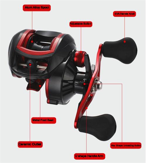 Item No: Audi baitcasting series Gear Ratio: 8.1:1 Max Drag: 8kg Package: Color box Material: High strength nylon fiber body+Alum Alloy spool OEM ODM is acceptable MOQ: 100pcs each size For more specs see below product details