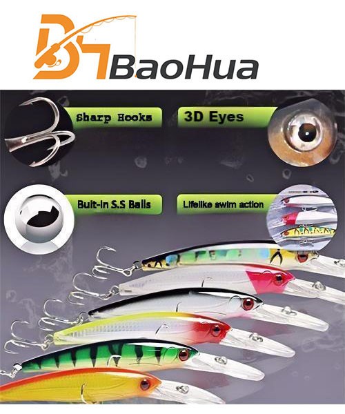 Item No.BHA0001 Material:ABS Length: 170mm Weight:32.5g Action:sinking Hook:#4 Color: 6 Package: blister pvc bag MOQ:100 pcs each color and 300pcs mixed colors OEM&ODM is available