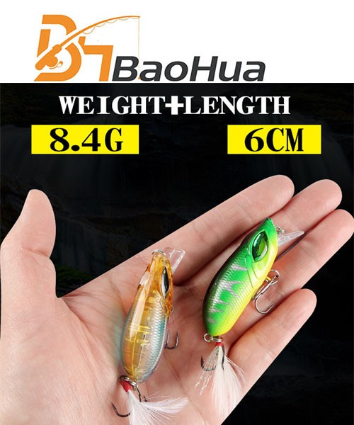 Item No.BHA0013 Material:ABS Length: 60mm Weight:8.4g Action:floating Hook:#8 Color: 5 Package:plastic box MOQ:100 sets OEM&ODM is available